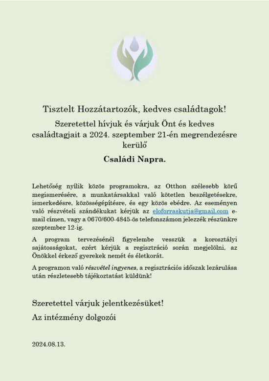 Tisztelt Hozzátartozók, kedves családtagok! Szeretettel hívjuk és várjuk Önt és kedves családtagjait a 2024. szeptember 21-én megrendezésre kerülő Családi Napra. Lehetőség nyílik közös programokra, az Otthon szélesebb körű megismerésére, a munkatársakkal való kötetlen beszélgetésekre, ismerkedésre, közösségépítésre, és egy közös ebédre. Az eseményen való részvételi szándékukat kérjük az eloforraskutja@gmail.com e-mail címen ,vagy a 0670/600-4845-ös telefonszámon jelezzék […]