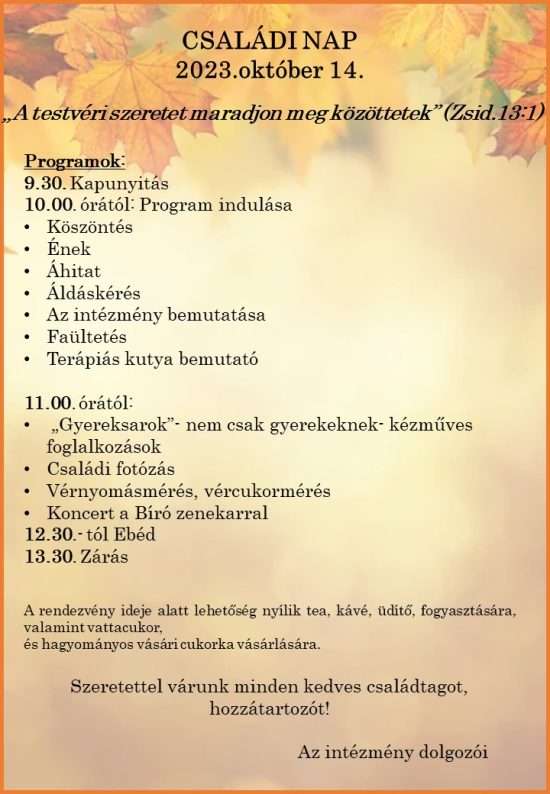 Október 14-én tartottuk 1. Családi Napunkat, mely szívmelengető közösségi élmény volt számunkra, és bízunk benne, hogy minden résztvevő vendégünk -kicsik és nagyok egyaránt- lakóink, közreműködő segítőink is hasonló érzésekkel, jó élményekkel tértek haza! Örülünk, hogy bepillantást tudtunk nyújtani intézményünk életébe, munkánkba, és együtt tudtuk élvezni ezt a csodálatos őszi délelőttöt. Szeretnénk köszönetet mondani mindenkinek, akik […]